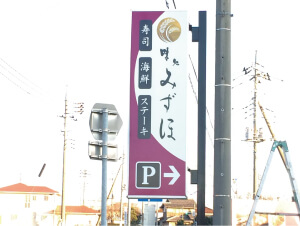 店舗やポールの袖につける看板を袖看板と呼びます。企業や店舗のイメージは、もとより、建築デザインや周囲の景観