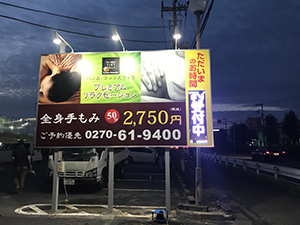 自立看板としても重宝されているのが建植看板で、群馬でもコンビニやレストランにガスステーションからクリニックや工場に至るまで広く利用されています。 4mを超えるような高さのものから1.2m程度のものまで用途に合わせて製作することができて、ポールサインや野立看板と呼ばれることもあるように太い1本の支柱に看板を設置することもありますが2本の支柱で支えるものも需要があって、 店舗や施設名称だけでなく住宅地や公園などに建てられている地図や案内板も建植看板です。 群馬の沿道にも大きな自立看板が設置してありますが、夜でも目立つように多くが照明つきになっており内照明や外照明で視認性を高めて車で移動しながらでも見やすくなるような工夫が行われています。